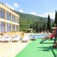 Вся территория комплекса колоритно украшена насаждениями кипарисов, пальм и олеандров. Особенность рельефа и множество зелени способствуют умеренным температурным показателям – здесь не бывает слишком душно. В распоряжении посетителей открытый пресноводный бассейн и уютная детская площадка. Спуститься к морю можно при помощи небольшого подземного перехода и, пройдя 150 метров, Вы попадете на прекрасный песчано-галечный пляж. Для бесплатного пользования предоставлено достаточное количество традиционных шезлонгов и зонтиков.