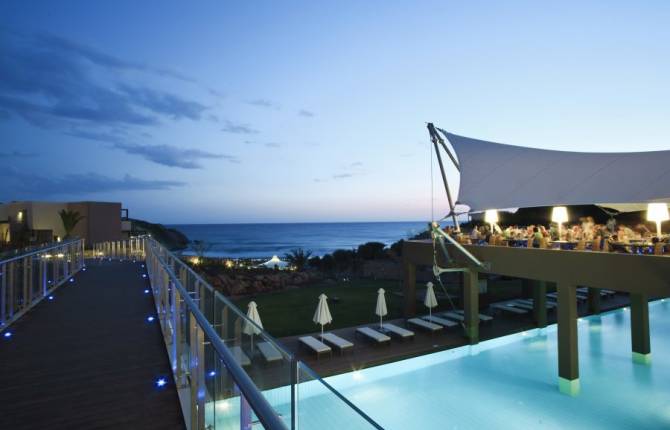 На склоне холма с буйной тропической зеленью, у залива Макриялос раскинулся высококлассный отель с шикарно обставленными номерами. Кондиционер, холодильная камера, LCD TV. душевая комната, фен для волос, набор для приготовления чая и кофе. За отдельную плату сейф. Уборка производится 6 дней в неделю. Профессиональный персонал говорит на иностранных языках, занимается обслуживанием гостей и принятием их на ресепшн круглосуточно. Берет на себя организацию туров и экскурсий.Предусмотрена аренда авто, мототехники и велосипедов. Бесплатный паркинг. По запросу услуги врача. На территории отеля современный магазин. Для досуга гостей: три бассейна (один с джакузи), спортивные корты, зал для тренировок, фитнес-центр, спорт на воде, и SPA процедуры. Проводятся анимационные шоу программы, в наличии амфитеатр. В шаговой доступности магазины, таверны. Для детей бассейны, игровые площадки и клубы, кроватка в номер, игровые приставки, диетическое меню и специальные стулья в ресторане. Развлекательные программы и анимация. Услуги няни. Рестораны отеля готовят блюда a la carte итальянской, средиземноморской кухни, бары заполнены разнообразными алкогольными и безалкогольными напитками, соками, мороженым и коктейлями. Работает программа "ALL INCLUSIVE".
