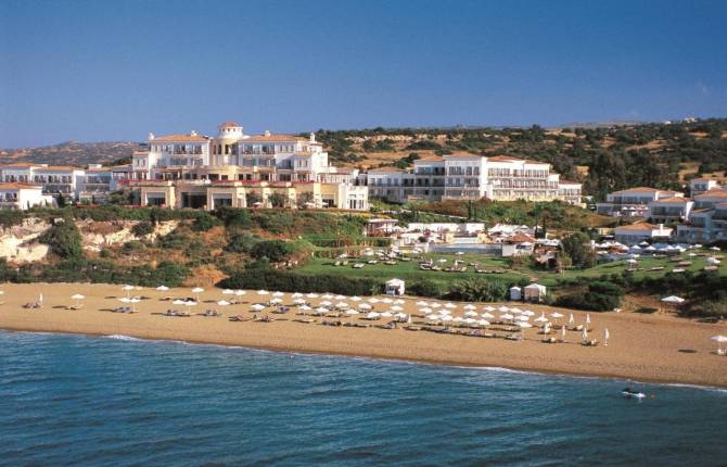 Отель находится на берегу Средиземного моря на западном побережье Кипра и выглядит как очаровательная древняя византийская деревушка. Стены домов из натурального камня, чисто выбеленные, двери и ставни деревянные. В центре стоит небольшая церковь с колокольней. Общая площадь – 85 тысяч м2. Из номеров открывается великолепный вид на море или сад. В комнатах – есть все удобства, телефон, фен, телевизор с русским каналом, сейф, кондиционер, мини-бар, тапочки, халат. Есть балкон или терраса. В номерах, начиная с категории Junior Suite, набор для приготовления чая и кофе машина. Уборка номеров два раза в день, смена белья ежедневно.