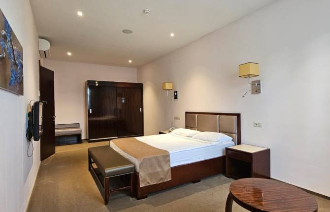 Покупая путевку в отель, вы вправе рассчитывать на комфортабельное размещение в одном из номеров категорий Стандарт, Люкс, Люкс ВИП, Полулюкс или Апартаменты. Каждый номер, помимо двухместного спального места, располагает дополнительным – ервораскладушка, а также всеми удобствами: кондиционер, мини-бар, душ, телевизор. Завтрак сервируется с 7.00 до 10.00 и также входит в стоимость путевки. Дополнительно можно воспользоваться бильярдом, посетить тренажерный зал. Также вблизи отеля располагается пляж искусственного озера, на расстоянии 200м.