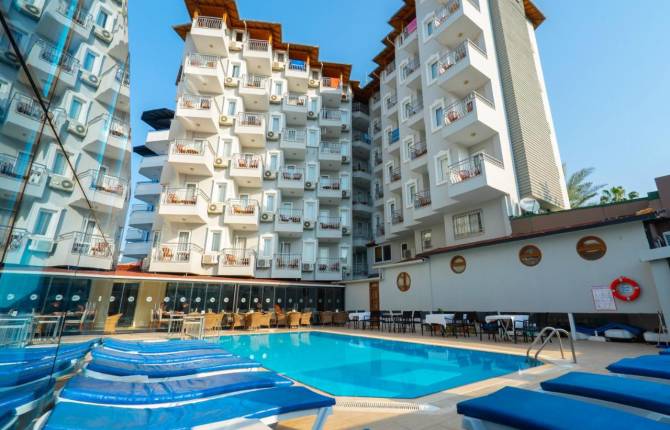 Отель расположен в курортном городе Анталья. Номера обеспечены комфортными условиями для проживания. Среди них есть номера стандартного типа, номера типа «сьют» и семейного типа. В комнатах: ванная, фен, мини-бар, а также мини-холодильник. Все номера имеют балконы с видом на море. Обслуживание номеров круглосуточное. Для удобства гостей есть парковка для авто. Также есть различные сервисы: круглосуточная регистрация, для багажа – камера хранения. За деньги можно постирать и погладить белье. Среди спортивных развлечений настольный теннис и бильярдная, за дополнительную плату можно арендовать велосипед. Также гостям отеля предлагается посетить сауну, баню, турецкий хамам или сходить на массаж (платно). Для спортивных тренировок, или просто для разминки есть тренажерный зал. Персонал ресторана в отеле угощает гостей завтраком, обедом и ужином. Питание организовано по типу «шведский стол». На территории комплекса есть ресторан работающий по меню. С 10.00 можно выпить коктейли на баре у бассейна или посетить лобби бар. Для детей оборудована отдельная секция в общем бассейне и игровая площадка. В ресторане есть детские стулья. Пляж содержится в зоне общественного, расположен в 800 метрах от отеля. Шезлонги матрасы и зонтики предоставляются за дополнительную плату.