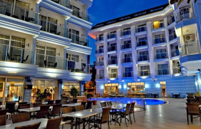 Тихий, уютный небольшой отель для семейного отдыха в центре города. Расположен на небольшой ухоженной территории, состоит из 3 6-этажных зданий, номерной фонд – 215 комнат, в 2007 г. была проведена реконструкция. Отель, прежде всего, подойдет семейным парам с детьми, для этого созданы все условия, а так же администрация позаботилась о людях с ограниченными возможностями. Номера в отеле 3-х типов: standard, family, family suite. Комнаты чистые, светлые, по-домашнему уютные. В каждом номере есть спутниковое ТВ, ванная комната, мини-бар, сейф, кондиционер. Для детей, при необходимости, предоставляют детскую кровать. Питание разнообразное 4-х разовое, по типу "все включено". На территории работают рестораны и бары. Есть детское меню, по запросу предоставляются детские стульчики. Позаботилась администрация и о развлечении, гости отеля могут поплавать в бассейне, посетить турецкую баню и массажный кабинет. Позаниматься в тренажерном зале или заняться водными видами спорта, поиграть в настольный теннис, дартс или бильярд, да и просто прогуляться по зеленой ухоженной территории отеля. Пляж городской, песчаный, но отель владеет собственно его частью, до пляжа 50 м. Для гостей отеля предусмотрены зонтики, шезлонги, полотенца (платно). На территории отеля есть 2 бассейна, автостоянка, 2 детских крытых бассейна, детская площадка и клуб. За дополнительную плату можно получить консультацию врача, посетить салон красоты, парикмахерскую. Вечером гости могут отдохнуть в ресторане, баре, в кинотеатре или оторваться в ночном клубе. Отель располагается в черте города, гости отеля могут не только насладиться пляжным отдыхом, но и посетить местные экскурсии, увидеть турецкие достопримечательности, прогуляться по местным рынкам.