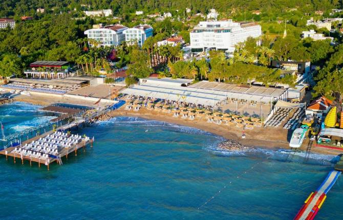 Отель в окружении гор и сосен расположен недалеко от побережья. Он представлен пятиэтажным корпусом с семейными и молодёжными номерами. В комнатах с ламинатом есть современный телевизор с российским каналом, телефон, центральный кондиционер, бесплатный сейф и мини-бар. В удобной ванной комнате установлен фен. По запросу отдыхающих предоставляется кроватка для малыша. В 4-х ресторанах (3 а’ля карт) гостям предлагается полноценное меню с возможностью заказа диетических блюд и детского питания. Подают блюда итальянской, турецкой и международной кухни. Также на территории комплекса расположено 6 баров с широким выбором прохладительных и алкогольных напитков. На ухоженной территории отеля есть 2 конференц-зала, теннисный корт с твёрдым покрытием, платный СПА-центр и прачечная. Гости могут сыграть в баскетбол, бильярд, мини-футбол, настольный теннис, заняться внешним видом в спортивном зале или на занятиях по аэробике. Для отдыхающих отеля недалеко от корпуса находится открытый пресный бассейн с водными горками. В плохую погоду все желающие смогут поплавать в бассейне закрытого типа с подогревом. Расслабиться и отдохнуть от дневной суеты поможет бесплатная турецкая баня, сауна. Для детей предусмотрен открытый бассейн с водной горкой, и детская площадка. Функционирует мини-клуб (возраст 4-12 лет). Услуги няни и коляска предоставляются за дополнительную плату. В ресторане есть детское меню и стульчики. Проводятся развлекательные программы. Вечером молодёжь может сходить на дискотеку с бесплатным входом и напитками, а для более спокойного отдыха гостей развлекает анимационная команда. Собственный галечно-песчаный пляж расположен в 30 метрах от отеля. Весь необходимый пляжный инвентарь предоставляется бесплатно.
