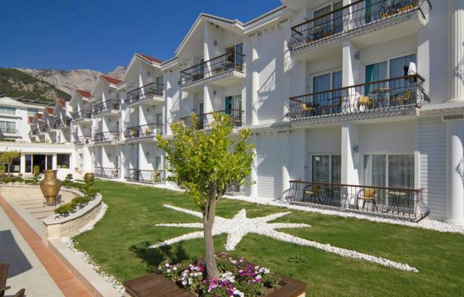 Большая территория отеля (8000 кв. м.) включает 137 номеров. Можно посетить 4 ресторана, 5 баров и большой конференц-зал для проведения мероприятий. В прохладное время года можно посетить крытый бассейн с подогревом. В отеле можно воспользоваться услугами врача, прачечной и почтовыми услугами. Подняться в свой номер можно с помощью лифта. Так же, при желании, можно воспользоваться wi-fi, который абсолютно бесплатен и располагается в лобби. В номере есть ТВ с российским каналом для русскоговорящих гостей, мини-бар и сейф при необходимости, а также, если вы привыкли путешествовать с маленьким ребенком, вы можете попросить для него детскую кровать. Отель может порадовать такими услугами, как утренняя и водная гимнастика, мини клуб, фитнес-центр, сауна, турецкая баня, джакузи, дартс и развлекательные мероприятия. Так же, при желании можно пойти на дискотеку, или, предпочитая спокойный отдых, посмотреть вечернюю анимацию. Перечисленные услуги абсолютно бесплатны. Для самых маленьких отдыхающих можно нанять няню или попросить детскую коляску, также детки могут провести время в мини-клубе (для 4 – 12 лет). В ресторане для них предусмотрено детское кресло, детская площадка в отеле. Для приятного отдыха на пляже можно взять с собой бесплатные полотенца, шезлонги, матрасы и зонтики. Территория песчано-галечного пляжа составляет 65 м в длину. Пляж принадлежит отелю. Прогуляться можно будет по деревянному пирсу. Если вы хотите остаться в отеле более, чем на 7 ночей, вам предоставляется бесплатное посещение одного из ресторанов. При проживании от 10 ночей, можно бесплатно посетить по одному разу 2 ресторана. Отель предоставляет бесплатное диетическое питание. Итальянский и рыбный ресторан работают по системе шведский стол.