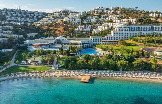 Замечательный отель на берегу Эгейского моря. Просторые номера выполнены в классическом стиле, оборудованы кондиционером, ванной комнатой, спутниковым телевидением, телефоном, мини баром и бесплатным сейфом. В каждом номере есть балкон, французский балкон или терраса с видом на море. Туалетно - косметические принадлежности предоставляют бесплатно. Можно забронировать номер для некурящих. Для отдыха с детьми предусмотрена детская мебель. Есть номера предназначенные для отдыха людей с ограниченными возможностями. Персонал говорит на турецком и английском зыка, на ресепшн русскоязычные сотрудники. Уборка номеров совершается ежедневно. Настольный теннис, водная аэробика, дартс, мини футбол, пляжный волейбол, баскетбол, прогулки на каноэ и катамаранах ,тренажерный зал, теннисные корты, сауна и турецкая баня – в бесплатном пользовании у гостей. За плату можно взять уроки игры в теннис, заняться виндсерфингом или дайвингом, полетать с парашютом или покататься на водных лыжах, поиграть в бильярд и заказать массаж. Для детей работает аниматор, игровой клуб, 2 бассейна, водные горки. Можно пригласить няню. Прачечной и химчистка платные. Wi-Fi доступен по всей территории отеля совершенно бесплатно. Конференц-зал рассчитан на 1200 мест. В главном ресторане интернациональная кухня в виде шведского стола. Также есть рестораны работающие по меню, бар наполнен освежающими напитка. Для детей предусмотрены детские кресла. Отель предоставляет услуги по хранению багажа, парковки, обмена валют, проката автомобилей, трансфер до аэропорта. На пляже зонтики, шезлонги и полотенца бесплатно. Также есть терраса для загара, можно воспользоваться шатром. Вечером проходит развлекательные и шоу программы, можно посетить дискотеки