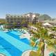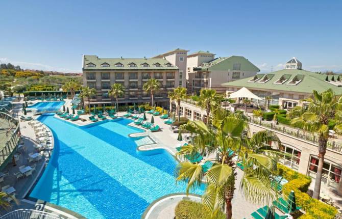 Этот отель был построен на территории, которая занимает площадь с большим количеством зон для отдыха, занятия спортом. Сам комплекс состоит из нескольких 3-4-этажных зданий, в которых можно пользоваться лифтами. Отдыхающим предлагается на выбор стандартные апартаменты и номера семейного типа. Стандартные номера есть с видом на бассейн и на окрестности. Есть номера для людей с ограниченными физическими возможностями. Во всех номерах на полу современное кафельное покрытие пола, сплит-система, душ, фен, телефон, платный сейф, мини-бар, куда входят прохладительные напитки, большой телевизор со спутниковыми каналами, чайник, а также наборы для приготовления чая и кофе. В наличии есть музыкальные и русские каналы. Отель обслуживает своих гостей по системе "Всё включено". Каждый отдыхающий может рассчитывать на завтрак, обед и ужин (шведский стол), поздний завтрак. В течение дня можно пробовать турецкие закуски, вкусные сладости местной кондитерской, мороженное, ночной суп. Доступно вегетарианское меню и блюда для диабетиков. У бара можно выпить алкогольные и безалкогольные напитки бесплатно с 10:00-24:00. После полуночи напитки импортного производства предоставляются платно. На территории есть A la carte рестораны, где можно бесплатно один раз заказать по меню любое блюдо. Для этого нужно предварительно записаться. Гости отеля могут бесплатно пользоваться баней, сауной, джакузи, фитнес-центром, настольным теннисом, водными горками, библиотекой, играть в пляжный волейбол, водное поло, дартс, заниматься аэробикой и гимнастикой. 6 дней в неделю работает анимация, 3 раза в неделю – живая музыка. На территории работает дискотека (16+). За дополнительную плату предоставляются услуги парикмахерской, игрового центра, прачечной, конференц-зала, частного врача, аренда авто, услуга няни, фотографа. В пределах комплекса работает два больших плавательных бассейна, 3 водные горки, детский бассейн и один крытый бассейн. Дети могут проводить время на игровых площадках, в бассейне. В ресторане есть детские стульчики для кормления и меню. За дополнительную плату можно заказать услугу няни.