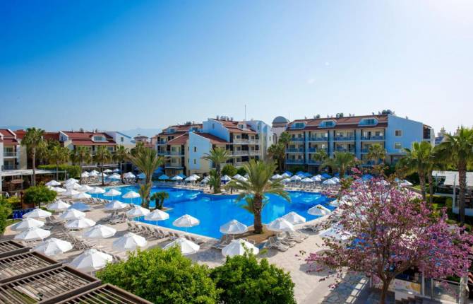 Гостиница расположена на берегу Средиземного моря. В пределах комплекса есть большая территория, на которой есть зоны для отдыха, бассейны, рестораны, тренажерные залы и не только. Здесь можно забронировать семейный номер со всеми удобствами. В номере можно пользоваться электрочайником, тостером, плиткой. Есть отдельный санузел и душевая, фен, телевизор, телефон и банные принадлежности, сейф. Гости отеля могут пользоваться зоной кухни, где есть микроволновая печь в наличии. На территории отеля можно пользоваться парковкой автомобиля, услугами прачечной, химчистки, SPA-центром. Можно взять напрокат автомобиль или заказать такси. Для отдыхающих на территории работают несколько бассейнов (открытый и крытый), которые работают в зависимости от времени года, игровые автоматы, площадки для пляжного волейбола, большого тенниса. За дополнительную плату можно поиграть в водные виды спорта. Для детей в отеле работает детский клуб, игровая площадка, которая оснащена антиударным покрытием, детский бассейн с горкой, дискотека, анимация. За дополнительную плату можно взять напрокат детскую коляску. В ресторане есть стульчики для кормления, переносное кресло, подогреватель для бутылочек. На территории работает основной ресторан и A la carte ресторан, а также несколько баров, где можно попробовать вкусные национальные блюда и выпить напитки местного производства.