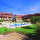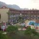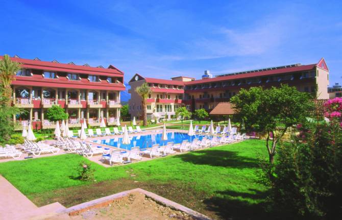 Отель имеет достаточно небольшую, но уютную территорию с большим количеством зеленых насаждений. Комплекс включает в себя два основных здания высотой в три этажа. Персонал в отеле квалифицированный, вежливый, русскоговорящий, что позволяет даже при незнании английского языка отдохнуть комфортно. Номера уютные, опрятные. В каждом из них отдыхающие смогут найти кондиционер, телевизор со спутниковыми каналами. В номере есть бесплатный беспроводной интернет, а с балкона открывается красивый вид на бассейн. В ванной установлена душевая кабина, есть фен. На небольшой территории есть сауна, турецкая баня, массажный салон. Для любителей активного отдыха руководство отеля установило теннисный корт. Близость к пляжу является еще одним преимуществом отеля. Пройдя всего 500 метров отдыхающие смогут покупаться в море, воспользоваться зонтиками, шезлонгами и полотенцами. О детях в отеле также позаботились. Специально для них здесь построили открытый бассейн, детскую площадку. По запросу отдыхающих, отель предоставляет детскую кроватку или кресло. Обслуживание в отеле осуществляется по системе "все включено", которая включает в себя завтрак, обед и ужин. У бассейна есть бар, в котором на протяжении дня бесплатно подают алкогольные и безалкогольные напитки. Выпить кофе по-турецки и покурить кальян здесь можно платно. На территории комплекса есть ресторан, где готовят блюда международной и местной кухни. В отеле работает врач, также есть прачечная.
