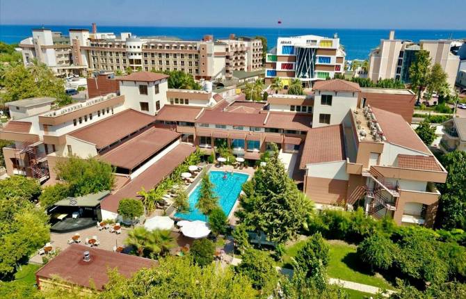 Уютный небольшой отель приглашает гостей насладиться природой Средиземноморья. Комплекс расположился в 1 км от центра Кемера и в 50 км от аэропорта. В распоряжении гостей комфортные номера с балконом, оформленные в строгом стиле. На полу постелено ковровое покрытие, имеется кондиционер. Также, к услугам гостей косметический столик и подставка под чемодан, по дополнительному запросу будет предоставлена детская кроватка. С балконов открывается захватывающий вид на море или зеленые леса. Обслуживание номеров круглосуточное. Всего в 100 метрах от отеля имеется собственный пляж, покрытый галькой. Кроме того, гостей ожидают открытый и крытый бассейны и аквапарк. Зонтики и шезлонги предоставляются бесплатно. Для более активного отдыха отдыхающие смогут посетить занятия водной гимнастикой, спортивный зал или поиграть в настольный теннис. А после тренировки можно расслабится в турецкой бане, сауне или пройти сеанс профессионального массажа. В дополнение, есть возможность поиграть в дартс или боулинг. Ресторан сервирует блюда по системе шведского стола, в распоряжении отдыхающих открытая терраса и крытый зал, в меню присутствует авторская кухня. Разнообразные закуски и широкий выбор напитков и коктейлей предлагают стильный бар в холле и бар у бассейна. Для детей предусмотрена детская площадка, детский клуб, басейн. А в столовой есть возможность заказать еду по специальному детскому меню. Отель имеет очень развитую инфраструктуру, что позволяет отдыхающим сделать покупки в магазинах, арендовать автомобиль и парковку, заказать услуги фотографа, посетить медицинский кабинет или парикмахерскую. По необходимости предоставляется трансфер до аэропорта.