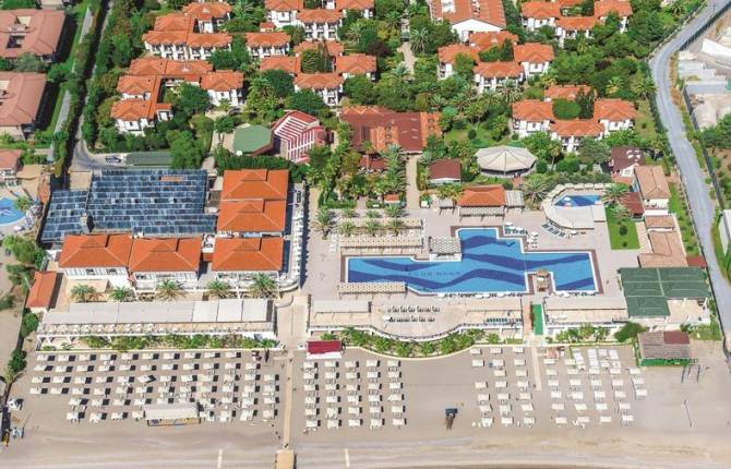 Гостиница расположена на берегу Средиземного моря и занимает территорию 100 тыс.квадратных метров. Сам отель состоит из основного 3-этажного корпуса и множества 2-этажных коттеджей, где на выбор можно забронировать себе номер. Номера есть стандартного типа, семейные, а также несколько номеров для людей с ограниченными физическими возможностями. Стандартный номер рассчитан на троих или четверых человек, в зависимости от квадратуры. В семейных номерах можно размещаться тоже до четырёх человек одновременно. Есть два типа семейных номеров – на 32 кв.метра и на 38. В номер по запросу предоставляется детская кроватка. В каждом номере есть телефон с международным выходом, телевизор со спутниковыми каналами, мини-бар с прохладной водой, платный сейф, балкон, ванная, фен, банные принадлежности. На полу в номерах лежит ламинат. Уборка номеров и смена полотенец в отеле происходит ежедневно. Постельное бельё меняется 3 раза в неделю. На территории отеля работает несколько бассейнов, конференц-зал, дискотека, амфитеатр, теннисный корт с возможностью освещения за дополнительную плату, фитнес-центр с современными тренажерами, СПА-центр, сауна, баня, баскетбольная площадка, кабинет врача, места для занятия водными спорта. Детям предоставляется крытый детский бассейн, мини-клуб для детей от 4-12 лет, детская площадка с навесом. В мини-клубе присутствует каучуковое покрытие, которое полностью безопасно для детей. В основном ресторане предлагается турецкая и европейская кузня. Питание подаётся по системе шведского стола. Каждый гость отеля может рассчитывать на завтрак, обед ужин, поздний завтрак и поздний ужин. На территории работает три ресторана A la Carte и 10 баров. Импортные напитки предоставляются за отдельную плату.