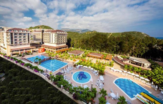 В инфраструктуру отеля входят: магазины, парковка, камера хранения. Имеется возможность обменять валюту. На территории отеля размещен бассейн с водными горками.Среди общего количества номеров доступны: стандартные номера, семейные и несколько номеров для людей с ограниченными возможностями. В каждом из них присутствуют все удобства: душ, туалет, фен, телевидение со спутниковыми каналами, телефонный аппарат, мини-бар. Отдыхающие могут использовать сейф. Уборка номеров производится ежедневно. Питание осуществляется по системе «all inclusive». Функционирует 2 ресторана, где предлагается большое количество блюд разных кухонь. Присутствует 5 баров, один из которых расположен на пляже. Там отдыхающие могут попробовать обширный ассортимент напитков. Детский досуг можно организовать, посещая мини-клуб для детей младшего и среднего возрастов. Персонал проводит детские развлекательные программы. Оборудован детский бассейн с водными горками. Имеется детская площадка. Активный досуг обеспечивается большим количеством разных вариантов времяпровождения. Отдыхающие могу играть в дартс, пляжный волейбол, настольный теннис. Предлагаются услуги массажного кабинета, турецкой бани, сауны. Оборудован современный фитнесс-центр со всем необходимым оборудованием. Так же отдыхающие могут заняться серфингом. Персонал отеля проводит активные развлекательные программы. Кроме того, предоставляются услуги прачечной, химчистки, прокат автомобилей, интернет-кафе. Данные услуги являются платными. Песчано-галечный пляж расположен совсем рядом с отелем. Матрасы, шезлонги, зонтики предоставляются отдыхающим в бесплатное пользование. Полотенца выдаются платно.