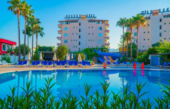 Общая площадь отеля занимает 6 000 кв.м. Территория небольшая и ухоженная. В отеле всего 100 номеров: 50 стандартных номеров, 50 – семейных с обычными и улучшенными условиями. В номерах есть телевизор с российским каналом, кондиционер-сплит, телефон, душ (ванна), фен и балкон с видом на море. Мини-бар и надежный сейф предоставляется за дополнительную плату. Питание в ресторане организовано по системе «все включено», подают блюда как местной так и интернациональной кухни. В местном баре имеется широкий выбор прохладительных и алкогольных напитков. Для тех, кто хочет посетить ресторан с ребенком, есть детские стульчики. Туристам предоставляются как платные, так и бесплатные услуги. Они смогут поиграть в настольный теннис, дартс и пляжный волейбол совершенно бесплатно. Также расслабиться в сауне и турецкой бане. Можно посещать занятия по аэробике. Гости смогут воспользоваться платными услугами. При желании заказать массаж, поиграть в бильярд или заняться водными видами спорта. Отдыхающие проведут время около бассейна и смогут расслабиться на лежаках под предоставленными для отдыха солнцезащитными зонтиками. Дети смогут порезвиться в специальном детском бассейне или игровой площадке. Для малышей организован мини-клуб (4 – 12 лет). По запросу можно воспользоваться платными услугами няни. Для гостей ежедневно организовываются бесплатная анимация и разнообразные мероприятия. На территории отеля есть прачечная, услугами которой гости всегда смогут воспользоваться. Также предоставляются услуги врача. Пляж чистый, галечно-песчаный. Для отдыхающих бесплатно предоставляются солнцезащитные зонтики, шезлонги и матрасы. На пляже полотенец нет. Бар на территории пляжа в полном распоряжении отдыхающих.