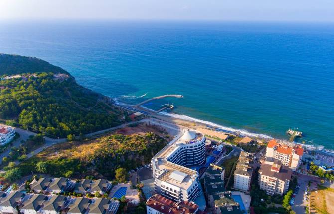 Чудесный, комфортабельный отель для семейного отдыха. Расположен отель вдали от городского шума, в окружении удивительной природы. До ближайшего города Аланья – 12 км, от аэропорта г.Антальи – 125 км. Недалеко от отеля находится красивейшая бухта с диким пляжем. В отеле 158 номер, два из которых оборудованы специально для инвалидов. Уборка в номерах ежедневно, смену белья производят дважды в неделю. В комнатах есть ТВ, мини-бар, ванная комната, фен, кондиционер. Для детей администрация отеля предоставляет детское меню в ресторане, детские кровати по запросу, няню за дополнительную плату. Развлекаться дети могут около детского бассейна и водных горок. Отдыхающие отеля могут прекрасно провести время не только на пляже, но и на территории отеля. Для досуга предусмотрены джакузи, турецкая баня, сауна, аэробика, на свежем воздухе можно поиграть в теннис, баскетбол и волейбол, функционирует центр подводного плавания. На территории отеля есть крытый плавательный бассейн с подогревом площадью 100 кв.м. Так же на территории работают 6 баров, закрытый и открытый ресторан, снек ресторан. За дополнительную плату отель предоставляет дополнительные услуги: аренду машин, прачечная/химчистка, парикмахерская, работает медицинский кабинет, трансфер. Если работа застала во время отпуска, отель может предложить свои гостям 2 конференц-зала вместительностью 450 и 250 человек. С наступлением ночи начинается все самое интересное. Каждый вечере администрация отеля проводим дискотеку ''DiscoViva'', где гостей ждет зажигательный ди-джей, танцевальная программа с сюрпризами, фейерверк, пенные развлечения. У отеля есть свой пляж, до которого 200 м. Пляж песчано-галечный, для отдыхающих предусмотрены шезлонги с матрасами, зонтики, полотенца. Так же есть деревянный пирс. Вход в море – галька. Работает бар.