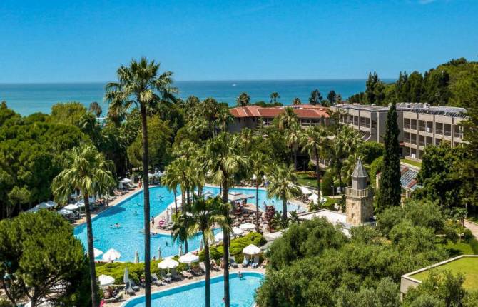Гостиница состоит основного корпуса, а также нескольких 4-5-этажных блоков. На выбор можно забронировать номера стандартного типа, номер с джакузи, апартаменты Делюкс, семейные номера, а также в наличии номер для людей с ограниченными физическими возможностями. В каждом номере есть отдельный душ, фен, банные принадлежности, тапочки и халат, мини-бар, бесплатный сейф, кондиционер, телевизор со спутниковыми каналами, телефон, балкон с видом. В некоторых номерах есть джакузи. Тип питания в отеле предоставляется по системе "всё включено". На территории работает несколько ресторанов, где можно попробовать вкусные блюда из морепродуктов, турецкой и европейской кухни. В отеле работает собственная кондитерская, которая порадует гостей своими изысканными десертами и сладостями. За дополнительную плату можно пользоваться парикмахерской, услугами врача, аренды автомобиля, прачечной, химчисткой, услугами фотографа, ювелирным магазином. СПА-центр предлагает большой комплекс услуг по уходу за лицом и телом. Можно сходить на платный массаж. Для деловых людей на территории работает конференц-зал, который вмещает одновременно до 150 человек и разделен на 2 секции. Все отдыхающие могут пользоваться бассейнами, теннисными кортами, тренажерным залом, площадкой для гольфа, волейбола, баскетбола. Вечером можно сходить на бесплатную дискотеку. Для детей есть несколько бассейнов (открытый и крытый), игровая площадка, детский клуб, В ресторане есть отдельное детское меню и стульчики для кормления. Услуга няни предоставляется дополнительно на платной основе. К оплате принимаются платёжные карты Visa и MasterCard.