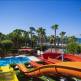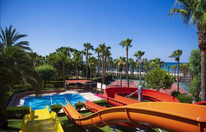 Гостиница находится на первой пляжной линии от моря и имеет собственный пляж, где гости отеля могут пользоваться бесплатно зонтиками, шезлонгами, раздевалками, душевыми и туалетом. Берег песчаный, вход в море пологий. В отеле есть стандартные номера с видом на море. Площадь такого номера от 18-24 квадратных метров. Рассчитан на троих человек. Есть в наличии одноместные номера площадью 20 квадратных метров, а также двухкомнатные номера повышенного комфорта и улучшенной планировки. В таком номере можно одновременно проживать 6 человек. Площадь номера составляет 60 квадратных метров. В номерах есть кондиционер (центральный), телевизор, мини-бар с питьевой водой, сейф. Номера убираются ежедневно. Смена постельного белья происходит 3 раза в неделю. На территории отеля работает основной ресторан, несколько баров, открытый и крытый бассейн, кабинет врача, парикмахерская, несколько магазинов, пункт обмена валют, прокат авто, 3 водные горки. Гости отеля могут провести время в сауне, бане, тренажерном зале, на дискотеке, аэробике, на площадке для волейбола, баскетбола. Работает два больших теннисных корта с бетонным покрытием. Весь инвентарь, который необходим для занятий спортом, предоставляется. За дополнительную плату можно играть в бильярд, посещать курсы подводного плавания, а также водные виды спорта. Для детей работает детский бассейн, игровая площадка, мини-клуб от 4 до 12 лет. Размещение с домашними животными в отеле запрещено.