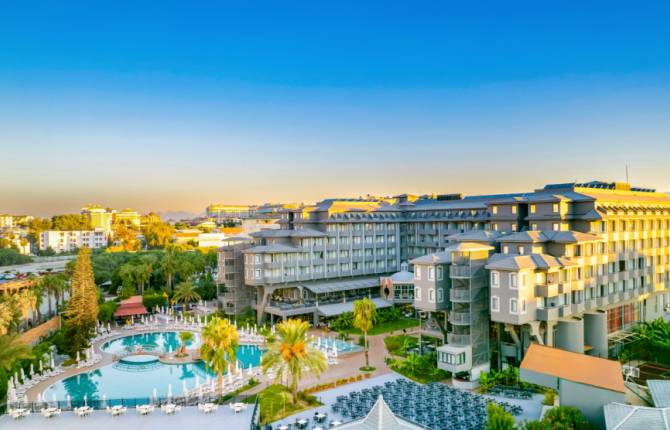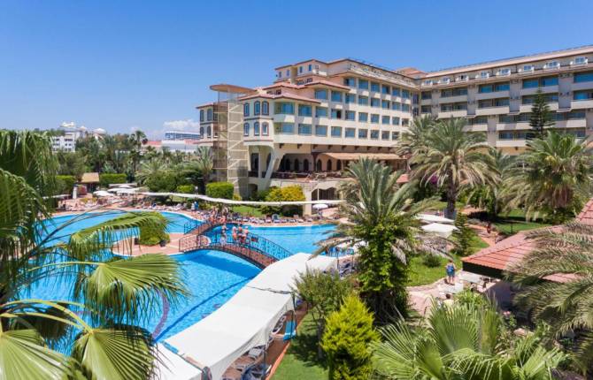 Этот отель расположен недалеко от моря. Пешком можно дойти буквально за несколько минут. В пределах комплекса есть несколько больших бассейнов, среди которых открытый, крытый и отдельный бассейн для женщин. В отеле работает несколько ресторанов, которые обслуживают по меню. На территории есть много зон, где раздаётся бесплатный интернет. Во всех номерах есть кондиционер, мини-бар с холодильником, большой телевизор со спутниковым телевидением. Гости отеля могут пользоваться балконом, собственной ванной комнатой, где есть все необходимые туалетные принадлежности, фен. Все номера убираются ежедневно, а также бесплатно предоставляется смена постельного белья и полотенец. Главный ресторан находится под открытым небом. В ресторанах, которые обслуживают гостей по меню, можно заказать блюда из морепродуктов, фирменные турецкие лепёшки. На территории гости могут пользоваться услугами баров, которые находятся у бассейна, на пляже и в лобби отеля. Для детей предусмотрена собственная игровая площадка, отдельный детский бассейн с водными горками. Гости отеля могут оздоровиться в СПА-центре, побывать в настоящей турецкой бане, сходить на массаж или подкачать мышцы и привести своё тело в тренажерном зале. У всех отдыхающих есть возможность поиграть в волейбол, настольный теннис, бильярд и другие виды спорта. За дополнительную плату можно посидеть в Интернет-кафе, заняться дайвингом, водными видами спорта, воспользоваться услугами частного врача, фотографа, химчисткой, прачечной. Платный сейф находится у администрации отеля. Если вам нужна местная валюта и вы не успели поменять деньги до приезда, то в отеле работает обменный пункт. Стойка регистрации принимает гостей круглосуточно. Персонал отеля владеет несколькими иностранными языками.