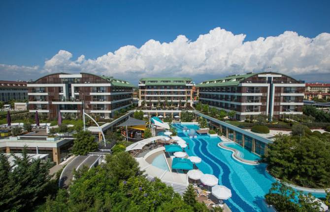 Этот 5-звёздочный отель привлекает туристов современным дизайном, романтической атмосферой и безупречным сервисом. Здесь большинство номеров имеют красивый вид на море. На выбор можно зарезервировать стандартный номер, номер люкс. Рядом с отелем есть много исторических мест и достопримечательностей, среди которых Грин Каньон, Титреенгель, Водопад Манавгат, Храмы Аполлона и Афины, Амфитеатр в Сиде. Во всех номерах есть современная удобная мебель и все необходимые принадлежности для отдыха. Можно пользоваться телевизором со спутниковым ТВ, мини-баром с холодильником, кондиционером, ванной комнатой с душевой, феном. Тип питания в отеле предоставляется по системе "Всё включено". Здесь работает ресторан с большим ассортиментом блюд средиземноморской кухни. Всего на территории отеля работает 3 ресторана и 8 баров, где можно в течение дня заказывать прохладительные напитки местного производства. Алкогольные и безалкогольные напитки предоставляются на платной основе. На территории комплекса работает открытый и крытый бассейн, конференц-зал, интернет-кафе, лифт, прачечная, салон красоты, пункт обмена валют, кабинет врача Гости отеля могут пользоваться СПА-центром, тренажерным залом, сауной, играть в дартс, шахматы, ходить в солярий, в кинозал. Бесплатно можно играть в бильярд, настольный и большой теннис, волейбол. Есть баскетбольная площадка и футбольное поле. За дополнительную плату можно освоить верховую езду, а также взять напрокат велосипед или заняться серфингом. Дл отдыхающих в отеле есть разнообразные водные развлечения. К оплате принимаются платёжные карты международного образца типа Mastercard, Visa, Eurocard. Размещение с домашними животными запрещено.