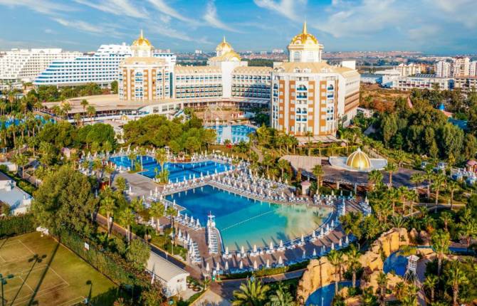 Комфортные номера различной категории ждут гостей! В них предусмотрены все удобства – ванная комната, телефон, кондиционер, сейф, есть фен, телевизор со спутниковыми каналами, ежедневно пополняющийся минибар, балкон. Доставка еды и напитков в номер, Гостиница имеет развитую инфраструктуру и готова принимать туристов, планирующих комфортный отдых. Гостеприимный персонал отеля обеспечивает максимальное удобство гостей. Круглосуточно работает стойка регистрации. Есть камера хранения багажа, прачечная, химчистка, глажка одежды, банкомат. Среди дополнительных сервисов гостям предлагается использование конференц-зала, крытого бассейна с подогревом. Кроме этого, в отеле вы найдете спа-центр с салоном красоты, джакузи, сауной, турецкой и финской банями и массажный кабинет. Для любителей спорта – корты, фитнес-центр с самыми современными тренажерами, занятия пилатеса, боулинг, установлены столы для тенниса, можно арендовать горный велосипед для прогулок. Ночной клуб с профессиональным ди-джеем приглашает молодёжь весело провести время. На уютной территории гостиницы предусмотрена парковка. Аниматоры предлагают насыщенную развлекательную программу. Работает караоке, кинотеатр. Пляж отеля с бесплатными зонтиками и лежаками расположен недалеко. Богатая инфраструктура позволяет детям разнообразно проводить время и удовлетворять все необходимые потребности. Можно покататься на водных горках аквапарка, поиграть на специальных развлекательных площадках. Есть игровые площадки – для стрельбы из лука, проводится детская дискотека и анимация. Питание в комплексе работает по системе «все включено». Дополнительно можно посетить 5 ресторанов, в том числе рыбный, итальянский, восточный и турецкий . Есть 6 баров, в том числе витаминный.