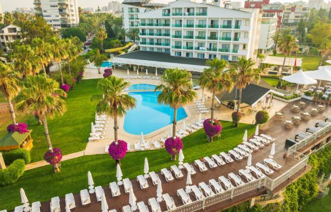 Комплекс обладает двумя неоценимыми достоинствами – близкое расположение к городу и морю. В комфортабельных уютных номерах современного типа предусмотрены все удобства – душевая кабина или ванна, балкон, телефон, центральный кондиционер, есть фен, TV с 2-я российскими каналами, минибар (в день заезда бесплатно), сейф, фен. Кровати на выбор односпальные или двуспальные, возможна софа в качестве дополнительной кровати. Вежливый персонал отеля обеспечивает максимальное удобство гостей. Круглосуточно работает стойка регистрации. Богатая инфраструктура позволяет разнообразно проводить время и удовлетворять все необходимые потребности. Для бизнес-туристов распахнули свои двери бизнес-центр, конференц-зал на 700 мест и зал заседаний на 300 мест. Есть кабинет врача, парикмахерская и прачечная. На уютной территории гостиницы предусмотрена удобная парковка. Для детей предусмотрена игровая площадка и небольшой аквапарк, состоящий из двух водных горок. Есть мини-клуб, по вечерам проводятся детские дискотеки. Семьи с детьми могут воспользоваться услугами няни. Можно воспользоваться детскими стульчиками. Гости отеля могут провести время в турецкой бане, посетить сауну, парную, посетить сеансы массажа и пилинга. Два бассейна открытый и крытый ждут желающих поплавать и заняться водной гимнастикой. Для любителей спорта – теннисный корт, спортзал, занятия по аэробике, настольный теннис. Есть волейбольная площадка. Есть дискотека. В течение дня осуществляется анимация. 6 дней в неделю проводится вечернее шоу. Систему питания в отеле можно выбирать, начиная от завтрака по типу «шведский стол», заканчивая системой «все включено». Дополнительно можно посетить 2 ресторана с европейской и турецкими кухнями, несколько баров на лобби, пляже, в парке и дискотеке. Есть «витамин бар».