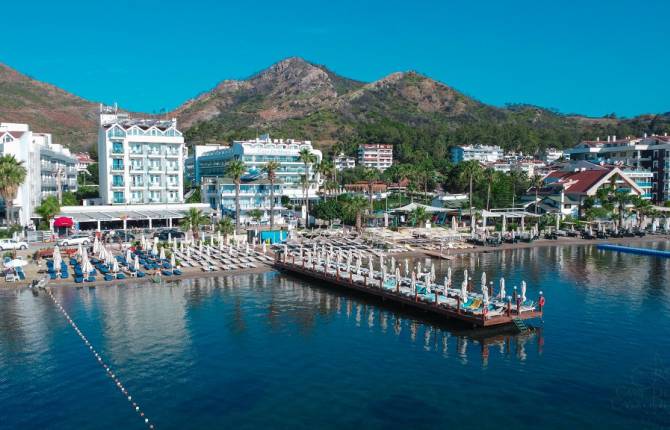 Отель расположен на берегу моря и имеет свой пляж. На территории комплекса есть парковка, прачечная, пункт обмена валют, открытый бассейн, салон красоты, сувенирный магазин и Спа-центр. Центральная часть города Мармарис находится в 5км от отеля. По периметру всего комплекса и в его середине есть много декоративной вечнозеленой растительности. Стойка регистрации гостей работает круглосуточно. За отдельную оплату вы сможете отдать ценный багаж в камеру хранения. Номера отеля оснащены балконом, телефоном, ванной комнатой с гигиеническими принадлежностями, спутниковым телевидением, феном, кондиционером, сейфом, мини-баром и беспроводным интернетом. Уборка в номерах проводиться ежедневно. В комнатах типа «Люкс» есть гостиная, спальня и лоджия. Пять ресторанов (один специализируется на блюдах из морепродуктов) и 4 бара предоставляют питание и напитки по системе «все включено». Здесь вы можете насладиться блюдами турецкой и международной кухни, алкогольными и безалкогольными напитками, деликатными закусками и тропическими коктейлями на любой вкус. На собственном пляже, который находится возле отеля, есть все необходимое для полноценного отдыха: зонтики, матрасы и шезлонги. Пользование этим инвентарем входит в стоимость проживания в отеле. Для детей оборудована специальная игровая площадка. Отель предоставляет возможность гостям поиграть в бильярд. Восстановительные и оздоровительные процедуры можно принять в турецкой бане, сауне, массажном кабинете, салоне красоты, Спа-центре. Тренажерный зал имеет весь необходимый инвентарь для проведения полноценных тренировок. Всего в нескольких км от отеля расположены разнообразные развлекательные инфраструктурные объекты Мармариса, для проведения активного молодежного досуга.