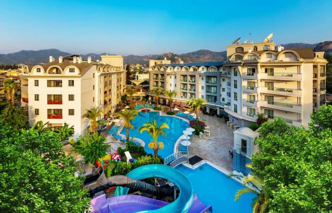 Отель располагает небольшой, но ухоженной территорией. Она декорирована зелеными кустарниками, клумбами и вечнозелеными тропическими деревьями. В комплексе находятся 3 бассейна, один из которых оборудован водными горками, 2 бара, 2 ресторана (Итальянский и Рыбный), ювелирный магазин, бутик, театр под открытым небом, прачечная, химчистка. Отдыхающие смогут оставить свои автомобили на парковке. К дополнительному сервису относятся услуги врача, фотографа, аренда автомобилей, ксерокс и факс. В ресторанах и барах вам предоставят широкий выбор блюд международной кухни, алкогольные и безалкогольные напитки местного и зарубежного производства по системе «все включено». Отель предоставляет 3-х разовое питание. Номера отеля оснащены мини-баром, кондиционером, спутниковым телевидением, телефоном, сейфом, феном, балконом и ванной комнатой. В некоторых типах номеров есть джакузи и мини-кухня. Уборка в комнатах проводиться ежедневно. Для активных гостей есть возможность поиграть в дартс, мини футбол, баскетбол, заняться стрельбой из лука, гимнастикой, посетить уроки танцев и фитнес центр. Ди-джей возле бассейна играет свои сеты, на территории часто играет живая музыка, аниматоры проводят свои мероприятия в различных локациях (в том числе и в театре под открытым небом). SPA-центр предоставляет много восстановительный процедур. На территории комплекса функционирует салон красоты, сауна и турецкая баня. Для детей в комплексе оборудована детская игровая площадка, мини-бассейн и мини-клуб. По предварительно заказу вам в номер поставят детскую кроватку. В ресторане есть стульчики для кормления малышей. Пляж находится в 850 метрах от отеля и оборудован всеми необходимыми аксессуарами и принадлежностями для полноценного отдыха.