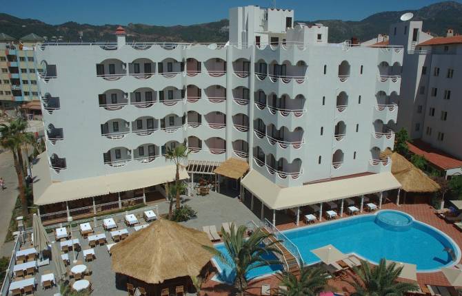 Всего 1 км разделяет отель и центр города – Мармарис. Аэропорт отдален на 14 километров. Это одно цельное пятиэтажное здание, вмещает в себе 78 номеров, из них – один номер для человека с ограниченными возможностями. Между этажами есть удобные лифты. Немало важным является телевизор с русскими каналами. Балконы есть не в каждом номере, только в некоторых. Уборка номеров каждый день. Для выхода в интернет сеть есть лобби. За определенную плату можно взять пароль от интернета и пользоваться ним. Перед входом в отель есть небольшой магазинчик с продуктами питания турецкого происхождения. Авто можно взять в аренду. При администрации отеля есть обмен валют. Площадь отеля вмещает бассейн, с открытым верхом. Для деловых встреч есть бизнес центр, очень вместительный и огромный зал. Пляж в 15 метров от отеля, полотенец не предоставляют, но все остальные удобства присутствуют. Вход в пляж песчано-галечный. Основной ресторан открывает свои двери в 07.00 утра, накормит гостей отеля завтраком и обедом, отведенное время для этого – час (с 16.00 до 17.00). На территории с 10.00 и до 01.00 ночи работает бар, где гости могут перекусить и выпить прохладительные напитки. Для маленьких гостей предусмотрено детское кресло в ресторане, детская площадка на территории отеля. И, конечно же, неглубокий бассейн. Бесплатно на площадках отеля можно поиграть в настольный теннис, шахматы. Для любителей бани – с 11.00 можно попариться. Сауна открывает свои двери также с 11.00. Среди платных услуг, которые предоставляет отель есть: джакузи, массаж и бильярд.
