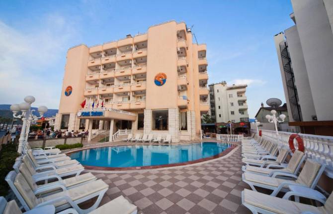 Данный отель расположен рядом с городом Мармарис и имеет небольшую, но ухоженную территорию с вечнозелеными кустарниками и тропическими деревьями. Два ресторана и три бара функционируют возле отеля. Здесь есть 2 открытых бассейна: детский и взрослый. Четырехэтажное здание комплекса выполнено в светлых тонах. Рестораны и бары предоставляют отдыхающим большое разнообразие местных и интернациональных блюд, алкогольных и безалкогольных напитков, тропических коктейлей и деликатных закусок турецкого и зарубежного производства. Импортные напитки, мороженое, закуски на протяжении дня, турецкий кофе и свежевыжатые соки не входят в стоимость проживания в отеле, за них придется заплатить отдельно. Все номера оснащены ванной комнатой, кондиционером, спутниковым телевидением с русскоязычными каналами, телефоном, феном и мини-баром. На полу лежит керамическая плитка. С окон номеров открывается отличный вид на море и горы. По предварительному запросу в номер могут поставить детскую кроватку. Для детей есть небольшой бассейн. При желании можно воспользоваться детским креслом в ресторане. На песчано-галечном пляже, который находится недалеко от отеля, можно свободно пользоваться шезлонгами, матрасами и зонтиками. За отдельную оплату вам предоставят возможность заняться водными видами спорта. Для любителей активного отдыха организованы такие виды досуга: дартс, бильярд и настольный теннис. Беспроводной интернет есть в лобби отеля и в интернет кафе, но пользоваться им можно на платной основе. При необходимости, есть возможность воспользоваться услугами врача и сейфом на ресепшине. Благодаря тому, что от отеля до главных достопримечательностей Мармариса всего несколько км, отдыхающие смогут разнообразить свой досуг посещением интересных экскурсий и развлекательных заведений города.