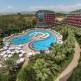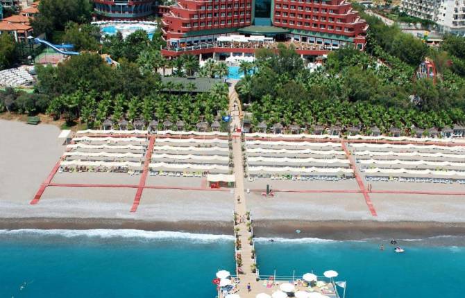 Данная гостиница находится в 90 километрах от международного аэропорта г. Анталия рядом с посёлком Авсаллар. В 10 километрах от отеля находится знаменитый на весь мир город Алания, где есть тоже очень много разных достопримечательностей, которые стоит увидеть всем, кто находится рядом. Очень удачное место расположения, до моря менее 200 метров. Всего на территории отеля есть 416 современных номера на выбор. Все номера очень уютные и комфортные. В номерах есть собственная душевая, фен, бесплатный мини-бар, сейф, кондиционер, спутниковое телевидение, телефон, балкон с хорошим видом. В гостинице есть отдельные номера для некурящих и для людей с ограниченными физическими возможностями. К вашим услугам в отеле работает 14 баров, 8 ресторанов, 2 открытых бассейна. Всем отдыхающим предоставляется бесплатно автостоянка. За отдельную плату можно воспользоваться услугами Интернет-кафе, заказать телефонный разговор в любую точку мира, освоить уроки по большому теннису, сходить на оздоровительный массаж, воспользоваться услугами СПА-салона, парикмахерской. За деньги можно поиграть в боулинг, игровые автоматы и в бильярд. Также на платной основе предоставляются услуги по погружению в воду, которые включают в себя краткие подготовительные курсы. Также на территории комплекса есть прачечная, химчистка, врач. Из бесплатных развлечений можно расслабиться в джакузи, сходить в турецкую баню, подкачать мышцы в тренажерном зале, сходить вечером на дискотеку. На территории отеля можно послушать живую музыку и понаблюдать за анимацией. Для детей есть игровая площадка, отдельный бассейн и детский клуб. На пляже можно бесплатно пользоваться шезлонгами и зонтиками. На территории пляжа работает бесплатный бар. Под залог можно взять полотенца.