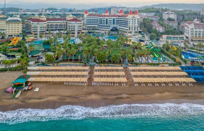 Современные номера имеют все необходимое, чтобы в них не скучать: спутниковое телевидение с музыкальными каналами, бесплатный мини-бар, балкон, откуда можно полюбоваться морем. Центральный кондиционер обеспечивает прохладу воздуха, а телефон в комнате – связь с внешним миром и администрацией отеля. Каждое помещение имеет отдельную душевую комнату с туалетом, в которой можно воспользоваться феном и чистыми полотенцами. Уборкой номеров занимаются ежедневно, постельное белье меняют каждые 3 дня. Для любителей шоппинга имеется торговый центр, а желающим усовершенствовать свое тело предоставляются на выбор подвижные занятия: баскетбол, аэробика, пляжный волейбол, водная гимнастика и многое другое. Бесплатно можно сходить в турецкую баню, попариться в сауне и поупражняться в фитнес зале. Очень хорошо организован детский досуг: веселые игры, мини-дискотеки, создание песочных картинок, дни пиратов и индейцев – это малая толика того, что входит в программу развлечениймладшего поколения. Кроме этого малыши могут поплескаться в неглубоком бассейне, занять себя в игровой комнате или на специальной площадке. В случае необходимости родители могут отдать ребенка под присмотр няни, за услуги которой придется заплатить дополнительно. Питание предоставляется в виде шведского стола по системе “ультра все включено”. Алкоголь и безалкогольные напитки разрешено выдавать с 10 утра до двух ночи. Всего, не считая главного ресторана, на территории работают 7 баров и 4 ресторана А-ля карт – Мексиканский, Азиатский, Османский, Средиземноморский.