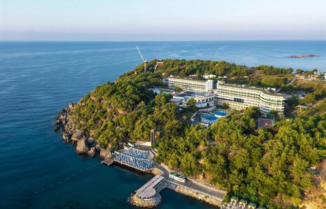 Отель находится рядом с морем в тихом средиземноморском местечке. В двух корпусах находятся номера различных типов. На территории комплекса есть 1 главный ресторан, 1 Турецкий и 1 специализирующийся на морепродуктах, 7 баров, собственная кондитерская, 11 бассейнов, теннисный корт, интернет кафе, амфитеатр и аквапарк, оснащенный 26 водными горками, тарзанкой, рафтингом и бассейном с искусственными волнами. Рестораны и бары работают по системе «все включено» и предоставляют разнообразные блюда местной и интернациональной кухни. Алкогольные и безалкогольные напитки турецкого и зарубежного производства. Номера в отеле имеют ванную комнату с гигиеническими принадлежностями, балкон, мини-бар (вода и сладкая газировка), спутниковое телевидение с русскоязычными каналами, центральное кондиционирование, сейф, фен и телефон. На полу лежит деревянное покрытие. Уборка в номерах проводится ежедневно. Для детей в отеле оборудована большая игровая площадка с разнообразным инвентарем, 3 бассейна, один из которых оснащен водными горками. В ресторане есть стульчик для кормления малышей. Отель предлагает широкий выбор интересных и активных анимационных мероприятий: водное поло, аэробика и аквааэробика, стэп, гимнастика, дискотека и вечерние шоу в амфитеатре. Фитнес центр оснащен всем необходимым инвентарем для полноценных тренировок. Активные гости комплекса могут поиграть в большой и настольный теннис, бильярд, дартс, мини футбол и пляжный волейбол. За освещение теннисного корта в темное время суток придется заплатить отдельно. Восстановить силы можно в Спа-центре, сауне, турецкой бане, джакузи и массажном кабинете. Собственный пляж отеля оснащен зонтиками, шезлонгами и полотенцами, пользование которыми входит в стоимость проживания в комплексе. К платным услугам относится: прокат оборудования для дайвинга, водные виды спорта, прачечная, прокат автомобилей, услуги няни, врача и другое.