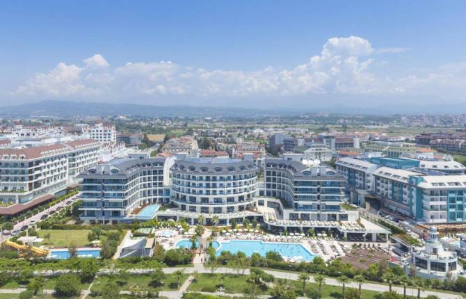Этот отель построен на побережье Средиземного моря и занимает большую территорию, где есть сад, много зон для занятия спортом, для отдыха. В отеле есть номера с видом на море, с частичным видом на море, с видом на сушу и на окрестность. Есть в наличии стандартные номера, семейные, люкс, супер люкс а также номер для молодых. В каждом номере есть отдельная ванная, платный мини-бар, сейф, кондиционер, кабельное ТВ, плазменный телевизор, телефон, чайник, наборы для приготовления чая и кофе. В некоторых номерах есть джакузи. На территории отеля работает 4 ресторана, 6 баров, 5 конференц-залов, 4 бассейна, среди которых один крытый бассейн с подогревом воды. В этом комплексе можно пользоваться бесплатно автостоянкой, сейфом. За дополнительную плату предоставляются услуги врача, салона красоты, химчистки, прачечной, интернет-кафе, проката авто. Можно платно организовать трансфер в аэропорт. Здесь есть все условия для отдыха людей с ограниченными физическими возможностями. Оплата в отеле проводится платёжными картами Visa, Mastercard, Eurocard. Гости отеля могут посещать баню, сауну, СПА-центр, ходить на массаж, играть в дартс, шахматы, настольный и большой теннис, баскетбол, футбол. На территории работает кинозал, прокат велосипедов, аквапарк с горками, дискотека. Можно заняться серфингом, виндсерфингом, аэробикой. Вечером доступна анимация на русском языке, а также дискотека, где можно прекрасно завершить свой вечер. В ресторане есть очень разнообразное меню блюд турецкой и европейской кухни. В барах можно выпивать алкогольные и безалкогольные напитки местного производства. Все напитки импортного производства предоставляются на платной основе. В отеле круглосуточно работает стойка регистрации. Персонал многоязычный, разговаривает на английском, турецком и русском языках.