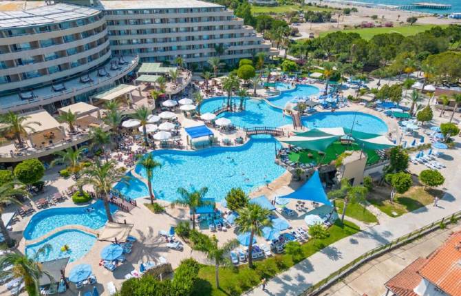 В Турции этот отель пользуется большим спросом среди туристов. Здесь можно хорошо отдохнуть, насладиться отличным тёплым средиземноморским климатом. На территории комплекса есть несколько блоков, в которых расположены номера для отдыхающих. Номера есть разные по типу, по комфорту, по площади и с разным видом. В наличии есть королевские номера, апартаменты повышенной комфортности и улучшенной планировки, семейные двухкомнатные номера, а также номера для инвалидов. Большая часть номеров с видом на море. Оформлены в классическом стиле. Все номера в отеле обслуживаются бесплатно и круглосуточно. Для каждого гостя в номере есть телевизор со спутниковым телевидением, кондиционер, сейф, мини-бар с холодильником, ванная комната, уборная. Все туалетные принадлежности предоставляются, поэтому нет необходимости брать их с собой в поездку, если собираетесь отдыхать в этом отеле. На территории комплекса есть конференц-зал с современным оборудованием, который вмещает порядка 300 человек. Имеется также ТВ-комната на 80 человек и свой диско-клуб. Тип питания в отеле предоставляется по системе "Всё включено". В ресторане можно очень вкусно поесть. Каждый гость отеля может впервые попробовать настоящие турецкие блюда и напитки на выбор, если ранее не приходилось. Повара готовят очень вкусно, профессионально, быстро и с душой. За отдельную плату можно заказать услугу проката автомобилей, автостоянки, вызвать такси. Камера хранения, прачечная, химчистка, доступ к Интернет, магазины, факс, принтер, услуги фотографа – это то, чем можно пользоваться платно. Из бесплатных развлечений в отеле имеется несколько теннисных кортов, площадки для баскетбола, волейбола. На территории работает 2 открытых бассейна, сауна, баня, фитнес-центр, крытый бассейн, джакузи, массаж. Для детей в номер можно заказать отдельную кроватку. В пределах комплекса есть детский клуб, игровая площадка и бассейн.