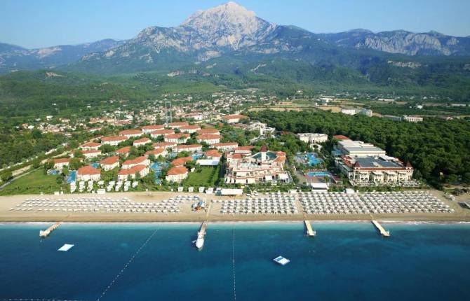 Отель расположен на первой береговой линии прямо у моря. У него большая территория, на которой находится 4 теннисных корта, 2 из которых сугубо детские. В самом только аквапарке есть 3 бассейна, оборудованные 26 водными горками различной степени сложности и высоты. SPA-центр предоставляет большое количество услуг, направленных на омоложение и восстановление организма. Несколько открытых бассейнов, декорированные различными оригинальными элементами, выглядят просто потрясающе. Всего в комплексе 674 номера различных категорий. В номерах есть фен, ванная комната, балкон или терраса, спутниковое телевидение с русскоязычными каналами, мини-бар, центральное кондиционирование, сейф, беспроводной интернет, чайный сервиз. Отель работает по принципу «ультра все включено». Шестиразовое питание (плюс дополнительные закуски и фрэши) осуществляется на высшем уровне. В барах вы сможете бесплатно пить различные местные алкогольные и безалкогольные напитки. На территории отеля работает команда из 50 аниматоров, которые проводят развлекательные и спортивные мероприятия. Для активных отдыхающих на территории SPA-центра проводятся занятия по аэробике и степ аэробике. Сауна, турецкая, русская баня, джакузи, парная, салон красоты и тренажерный зал всегда к вашим услугам. Кроме того, за отдельную оплату можно попробовать 17 видов массажа и целый комплекс оздоровительных процедур. Можно заняться водными видами спорта, пляжным волейболом, мини и пляжным футболом, настольным и большим теннисом, боччей, дартсом и баскетболом. Для детей сооружен детский клуб (разделенный на несколько секций по возрастам), аквапарк с водными горками, кинозал, детский ресторан и игровая комната. Собственный галечно-песчаный пляж оборудован зонтиками, шезлонгами, матрасами и шатрами. Каждый отдыхающий по желанию получит индивидуальное полотенце.