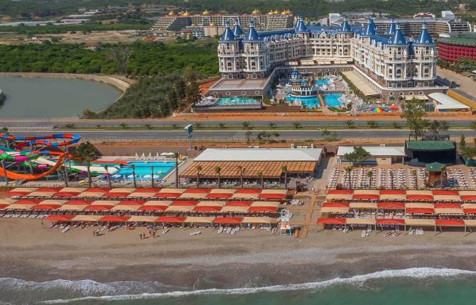 Клубный отель Ju Haydarpasha Palace относится к категории 5* расположен близ города Аланья в местечке Тюрклер. Аэропорт находится в 100 километрах от отеля. Отель Ju Haydarpasha Palace располагает собственным пляжем, который находится в 200 метрах от главного корпуса, нужно пройти через подземный переход. Комплекс располагает несколькими корпусами поражающими своим великолепием, бассейнами для детей и взрослых, аквапарком, спортивными площадками, Спа-цетром и фитнес залом, детской площадкой и мини-клубом для самых маленьких, рестораны и бары. На всей территории работает Wi-Fi. Номерной фонд насчитывает более 496 номер роскошных комфортабельных комнат, в которых есть все самое необходимое для отдыха: кондиционер, балкон или терраса, сейф, мини-бар, банные халаты и косметические средства для ванны, LCD телевизоры, спутниковое телевидение с русскими каналами, телефон. В Ju Haydarpasha Palace семь ресторанов, шесть баров. Отель работает по системе «Все включено" с раннего утра до ночи, а также гостям отеля предлагают меню а la Carte. Можно насладиться ярким многообразием блюд как турецкой до международной кухни, есть детское, диетическое и вегетарианское меню. Персонал отеля говорит на русском языке. На всем протяжении Вас будут развлекать аниматоры, которые составили специальную взрослую и детскую программу.